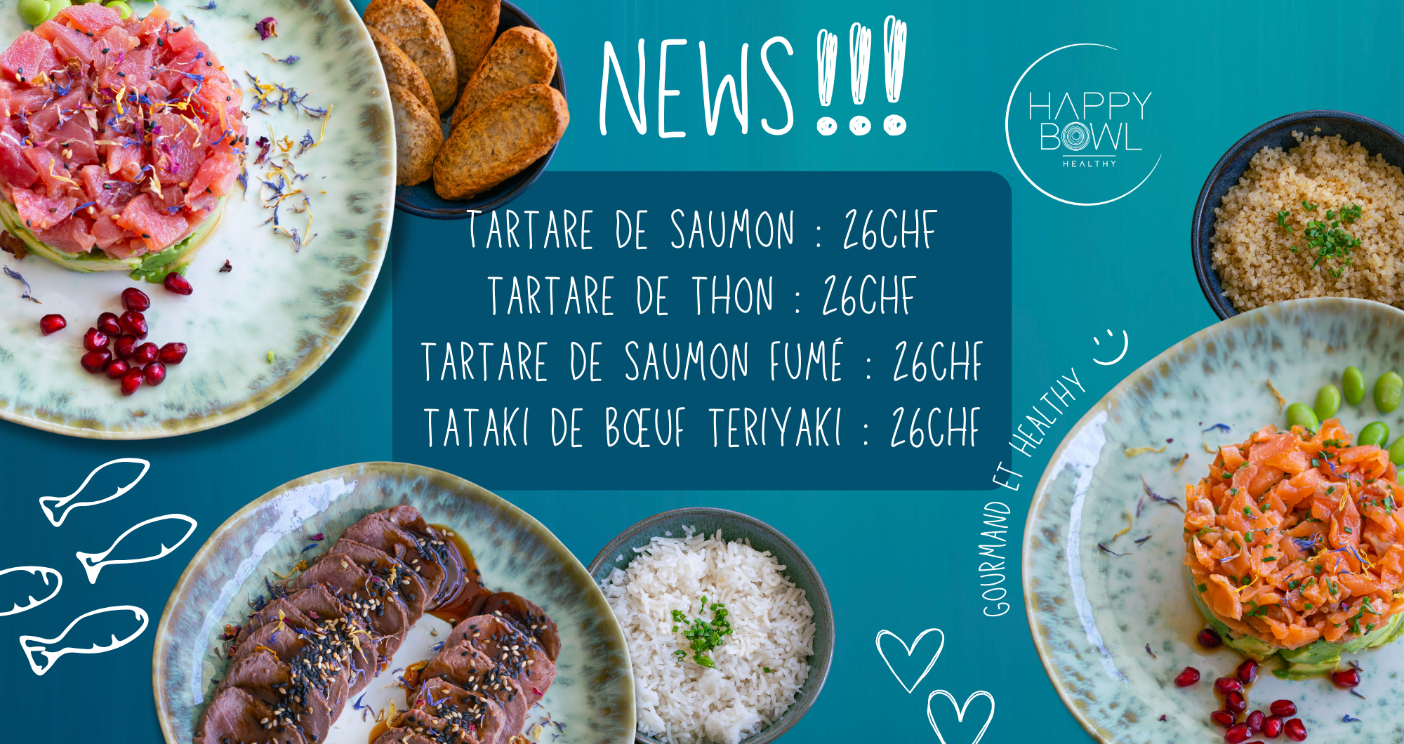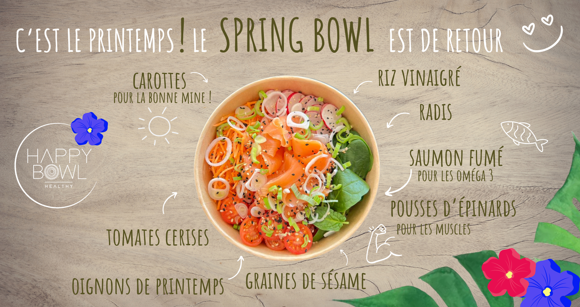 Une base de riz basmati ou de quinoa, des protéines, des crudités, des toppings et une délicieuse sauce à choix.